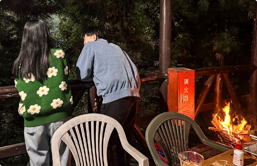 - グリルの音、乾杯の声、そして火のゆらめき。